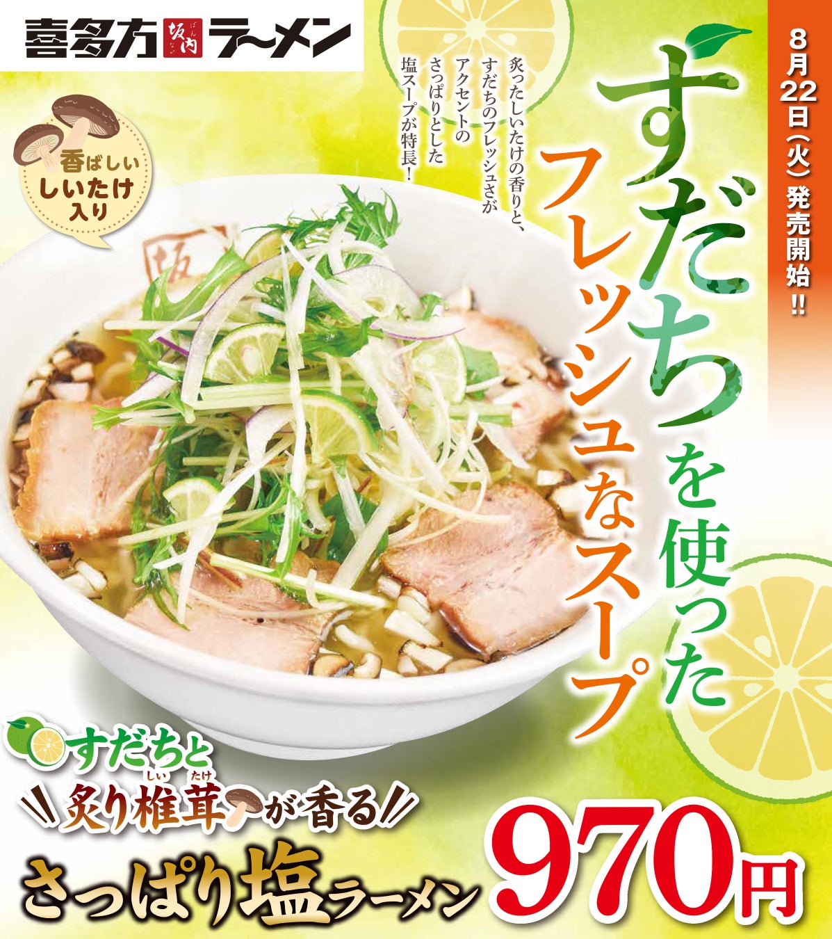 喜多方ラーメン坂内の完全新商品として、昨年期間限定で販売し、大変ご好評をいただいた『すだちと炙り椎茸が香るさっぱり塩ラーメン』。香ばしく炙った椎茸を、すだちの爽かな香りでさっぱりと仕上げた塩スープの限定ラーメンを、今年も満を持して販売いたします。昨年の販売実績では、期間限定でありながらも看板商品の「喜多方ラーメン」「焼豚ラーメン」に次いで上位3位の販売数を誇りました。また、男性客が多い当店において女性の支持を多く得た商品でもあります。味の決め手は、丼に刻んだ椎茸と、坂内こだわりの焼豚を仕込んだ際にできる“自家製ラード”に、おろしにんにくとブラックペッパーを加え、1杯ずつバーナーで炙って作る、香ばしい椎茸の風味が活きたラード。そこに塩ベースのスープを入れ、1杯ずつ手作りの出来立てスープで提供いたします。トッピングにはすだち、キャベツ、白髪ねぎ、みょうが、赤玉ねぎ、水菜などの野菜をふんだんに使用し、ヘルシーさを際立たせました。坂内の特製焼豚は「喜多方ラーメン」と同じく5枚を盛り付けてご提供いたしますので、満足感溢れる逸品に仕上げております。