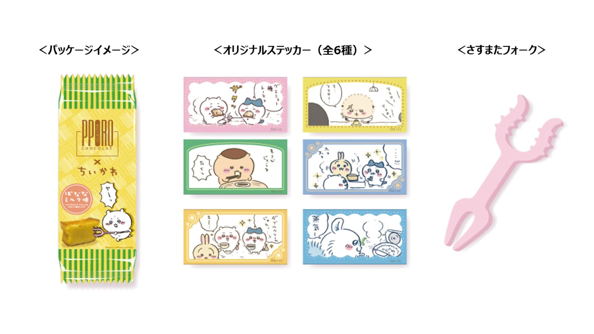 国産生乳100%使用したしっとり濃厚なチョコレートケーキ「ポロショコラ」。その「ポロショコラ」シリーズから「ちいかわ」との初コラボで  オリジナルフレーバー「ばななミルク」を発売。バナナとホワイトチョコのやさしい味わいのポロショコラに、「ちいかわ」の物語に登場する  “さすまた”デザインのオリジナルフォークとオリジナルステッカーを付けました。