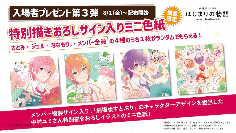 イラストは『劇場版すとぷり』のキャラクターデザインを担当した中村ユミさんの特別描きおろしとなっており、さらにメンバーの複製サインも入っている豪華なミニ色紙となっています!