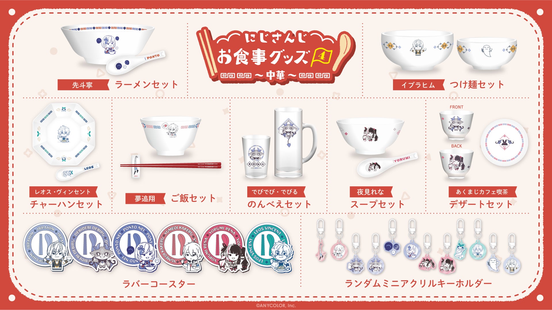 「にじさんじお食事グッズ4~中華~」のラインナップは、つけ麺セット、のんべえセット、ラーメンセット、ご飯セット、スープセット、チャーハンセット、デザートセット、ラバーコースター、ランダムミニアクリルキーホルダーの計9種類。