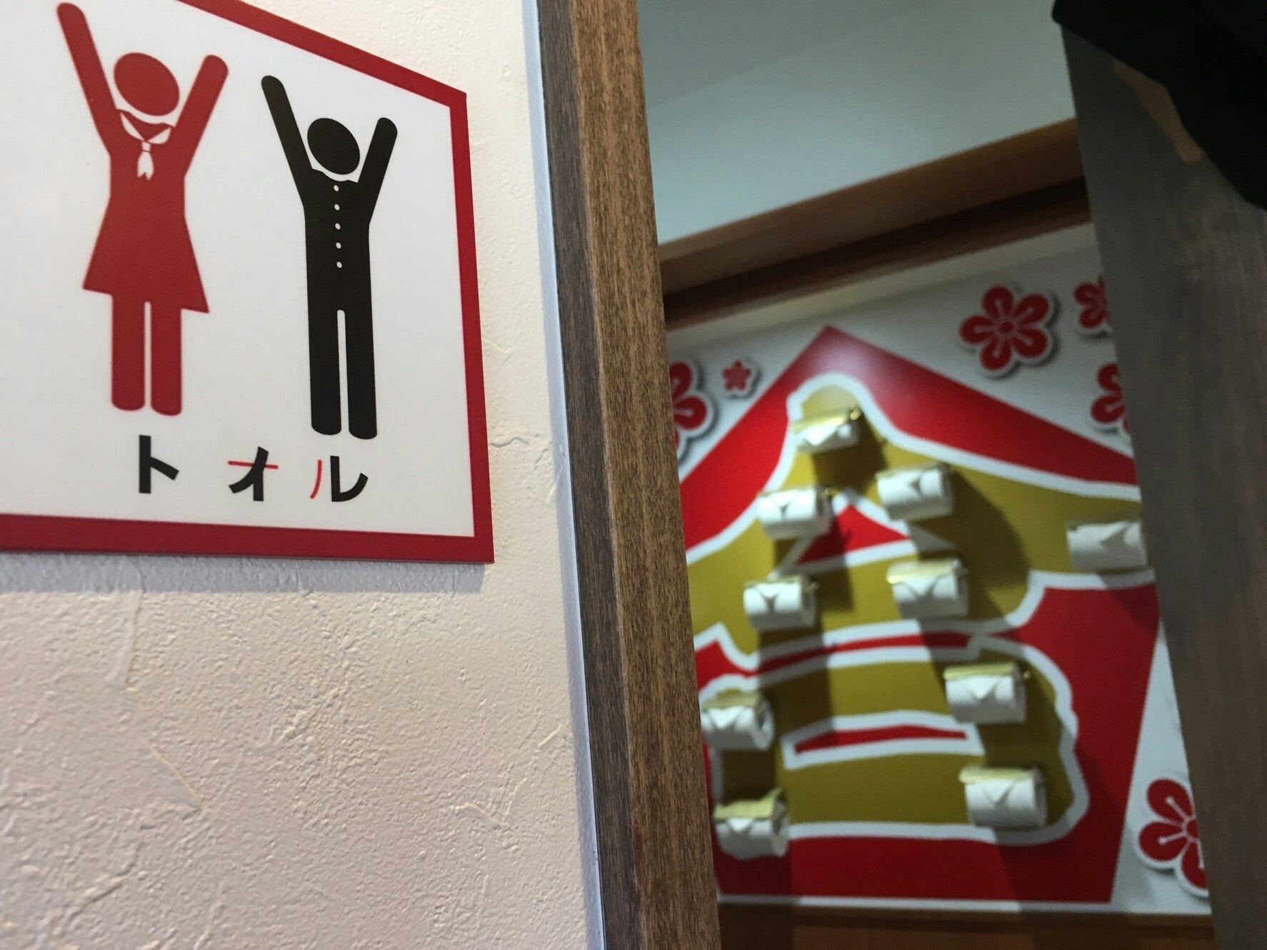 よく見ると「トオル」と表記されています。個室内は、大きな「合」の字に合わせて拭く紙(福の神)がいっぱいです。