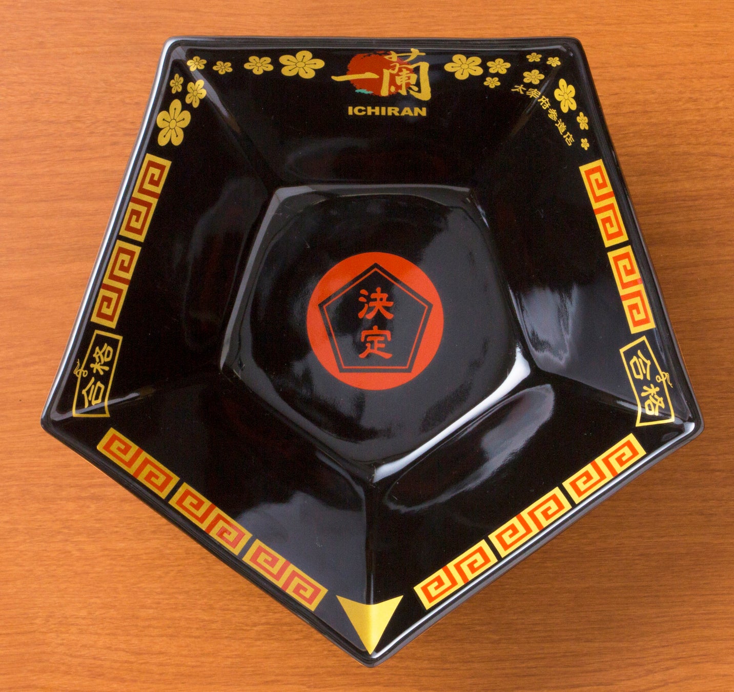 五角(ゴカク)のどんぶりで、お客様のもとに合格(ゴーカク)をお届けいたします。合格どんぶりには、太宰府の象徴である【梅】、縁には【合格絵馬】、そして、どんぶりの底には【決定】の文字があしらわれています。