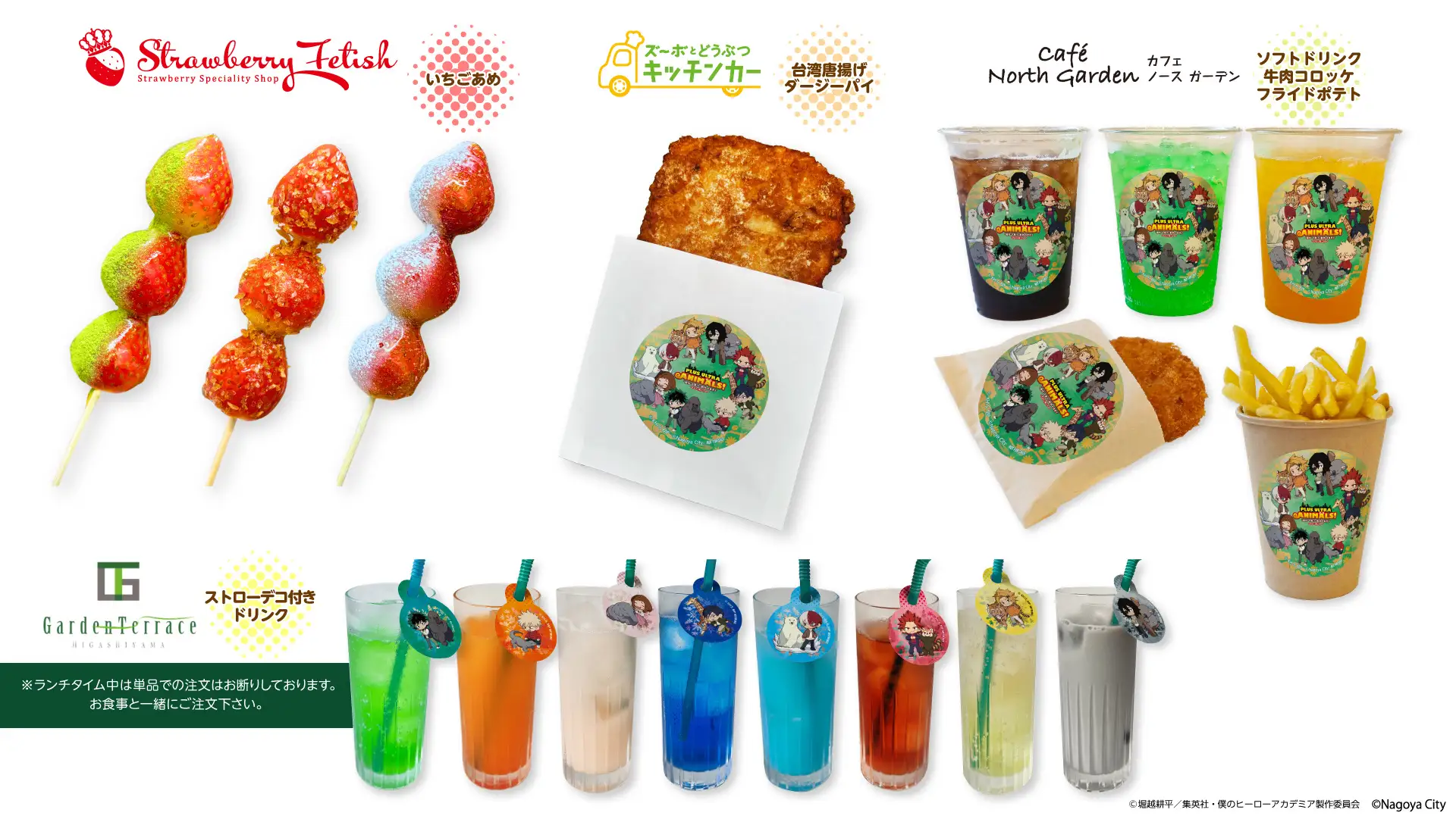 ストロベリーフェチでは、緑谷の抹茶いちごあめ、爆豪のパチパチコーラいちごあめ、轟のホワイトチョコいちごあめ(各700円・税込)が販売されます。ズーボとどうぶつキッチンカーでは台湾唐揚げ ダージーパイ(1,000円・税込)、カフェノースガーデンではソフトドリンク(各500円・税込)、牛肉コロッケ(600円・税込)、フライドポテト(700円・税込)が用意されています。