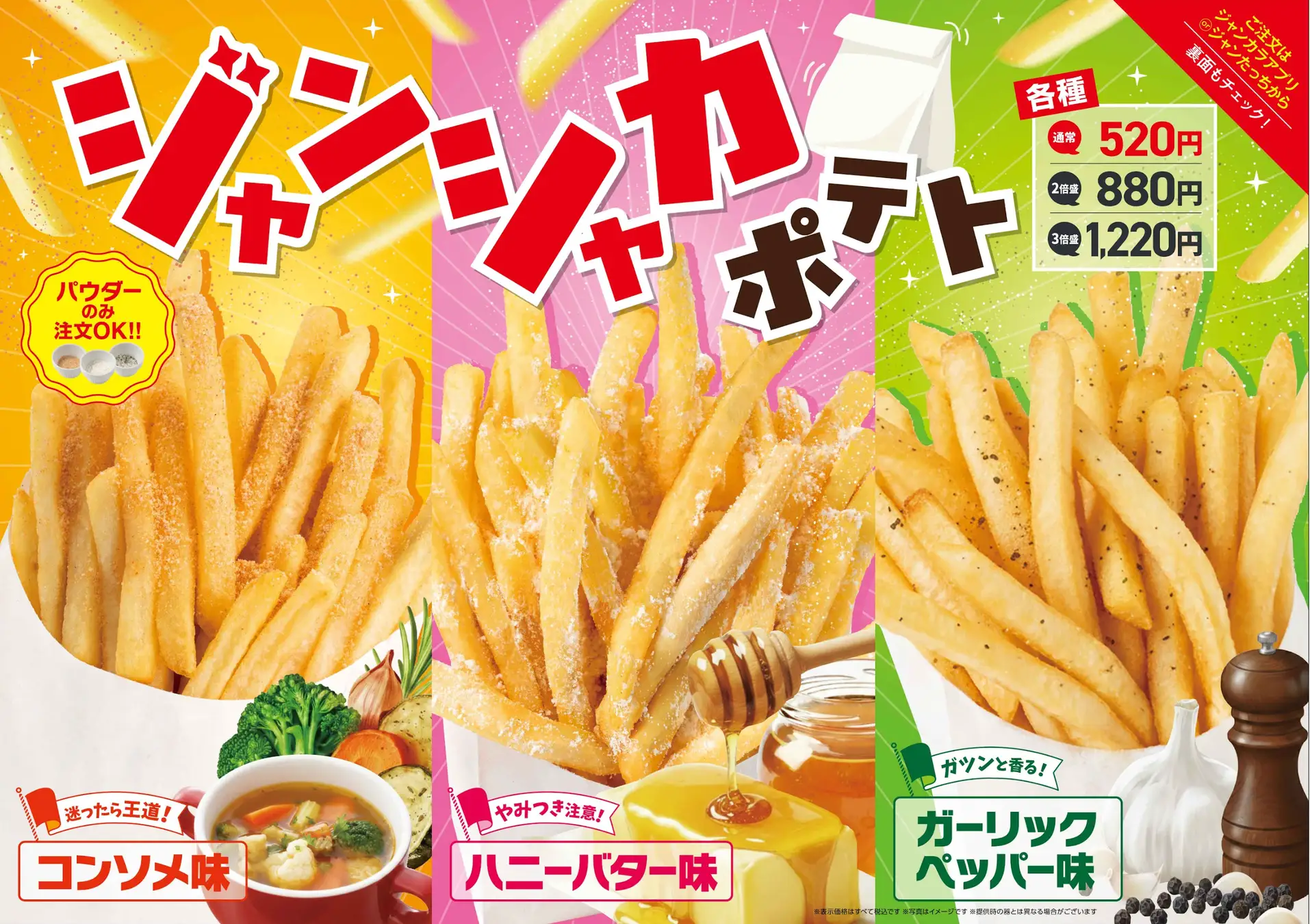 フレーバーは、王道の美味しさ「コンソメ味」、やみつき注意のあまじょっぱさが魅力の「ハニーバター味」、クセになるパンチある刺激の「ガーリックペッパー味」の3種類です。サイズも通常・2倍盛・3倍盛から選べるため、少人数から大人数まで幅広く対応しています。